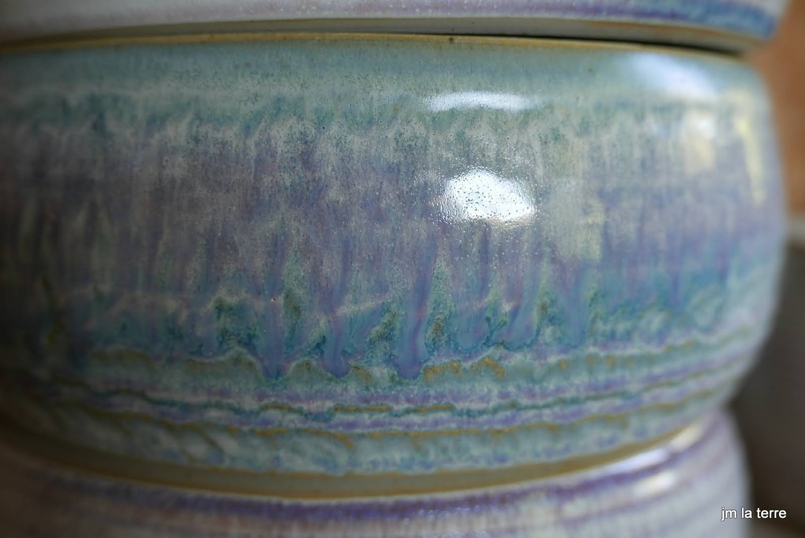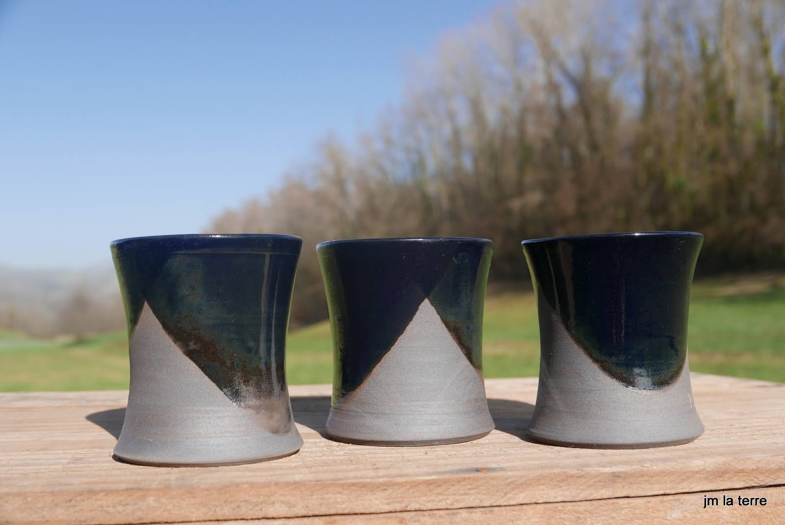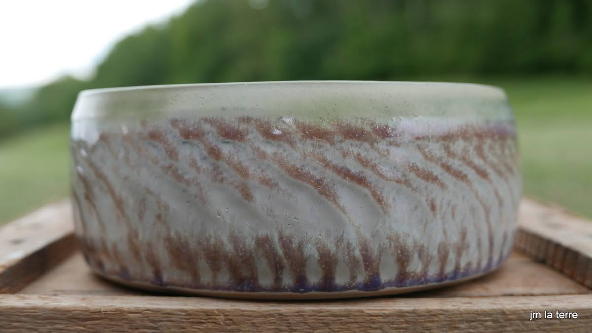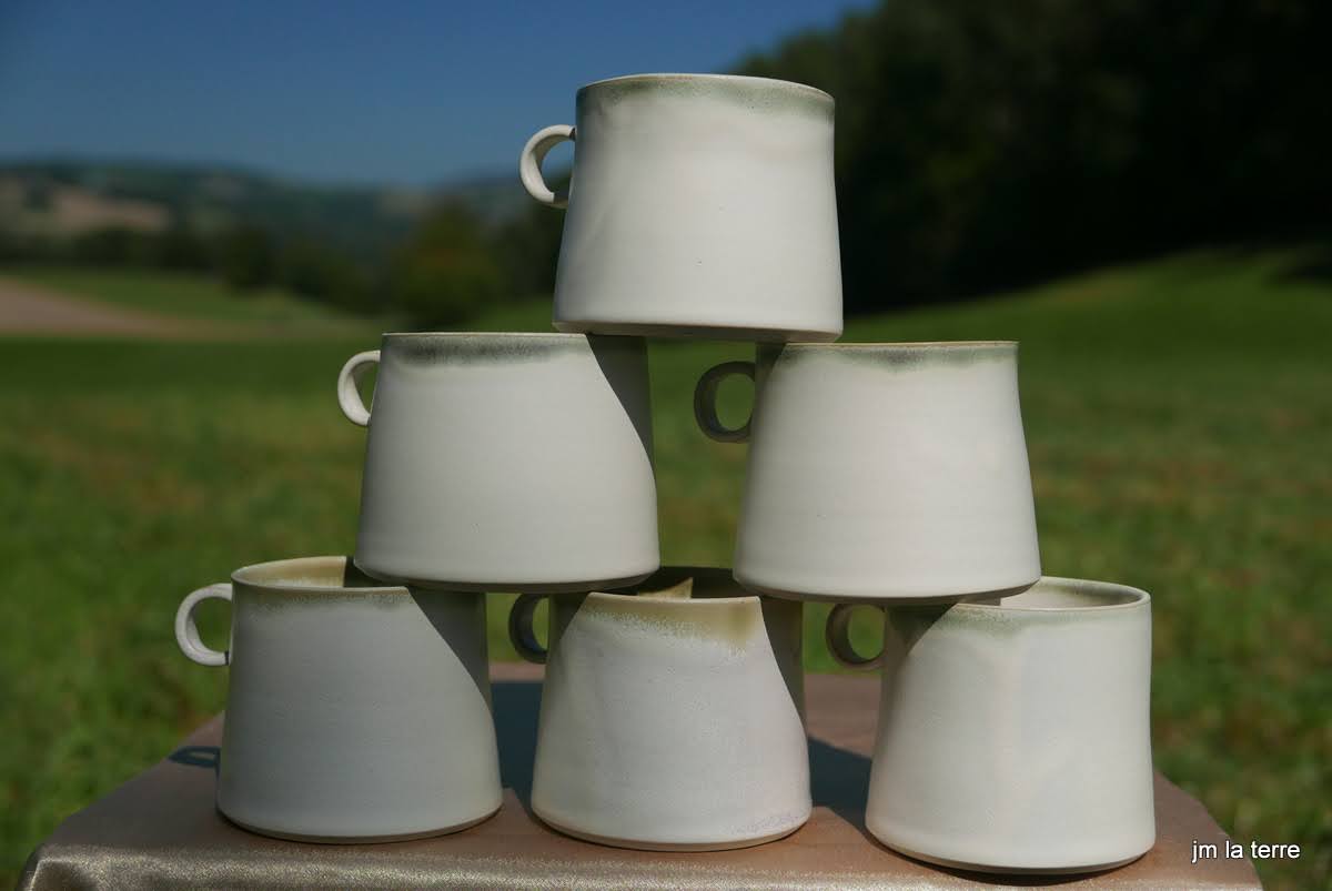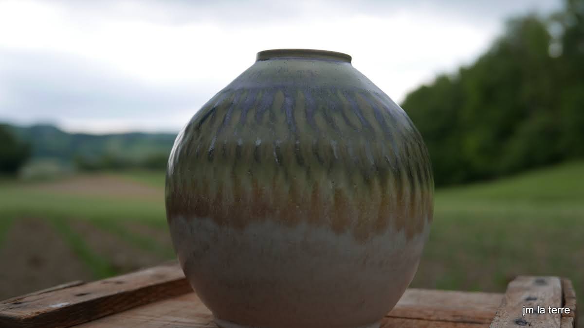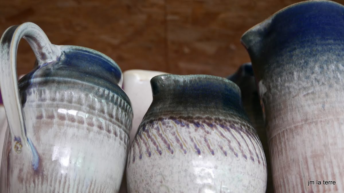 Grès blanc, brun, gris ou noir, lisse ou chamotté, avec des émaux faits maison, cuits-souvent en réduction- à 1280°C, peu de décor mais des recherches de couleurs et de textures parfois surprenantes quant la terre brute chamottée s’oppose au toucher soyeux de l’émail satiné….