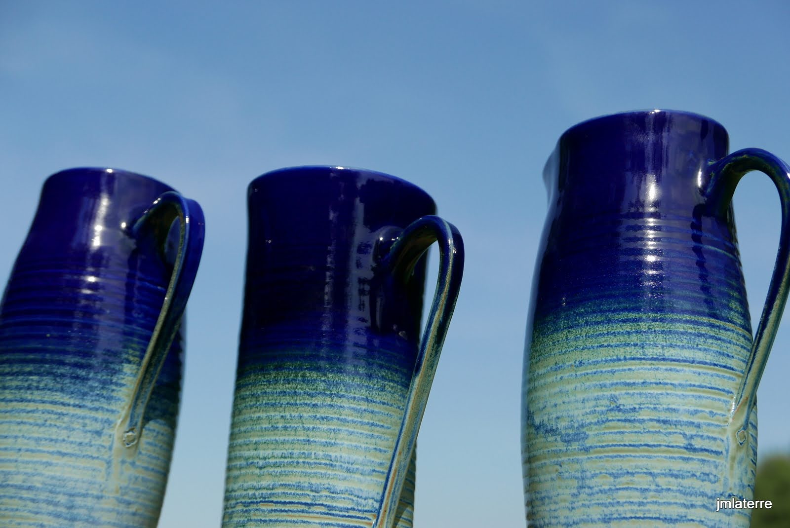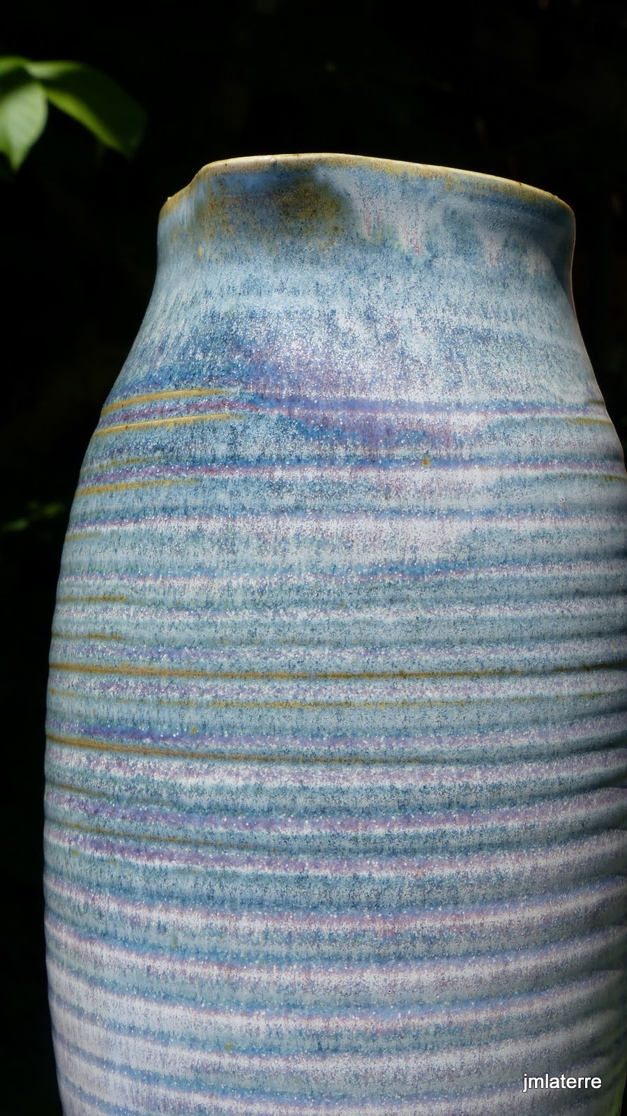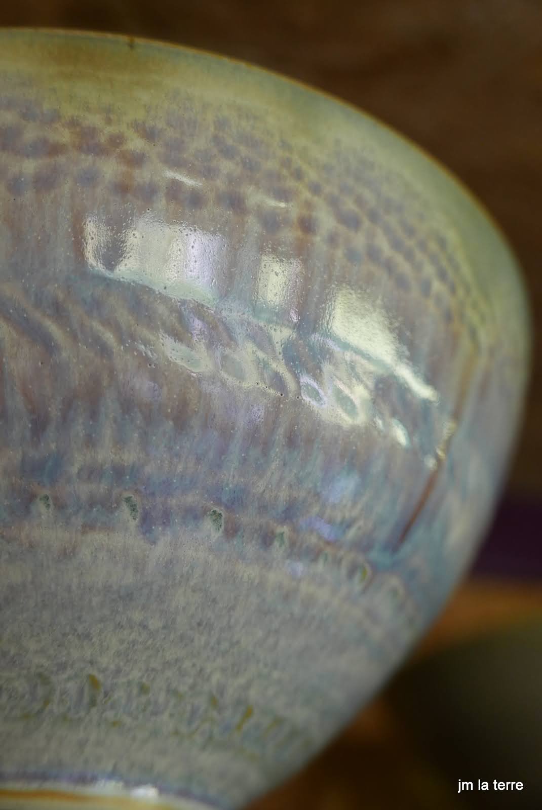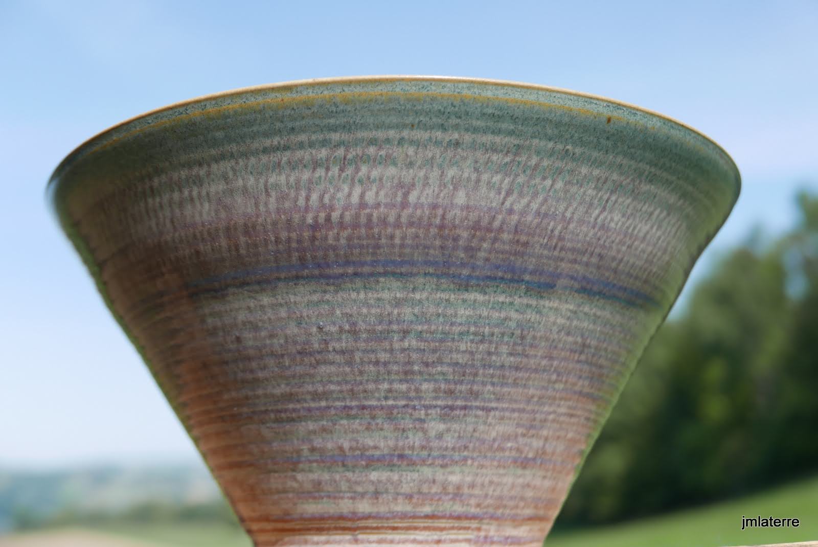 Grès blanc, brun, gris ou noir, lisse ou chamotté, avec des émaux faits maison, cuits-souvent en réduction- à 1280°C, peu de décor mais des recherches de couleurs et de textures parfois surprenantes quant la terre brute chamottée s’oppose au toucher soyeux de l’émail satiné….